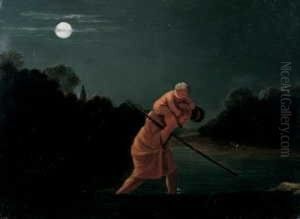 A Southern Landscape With Two Figures Bathing Near Ruins