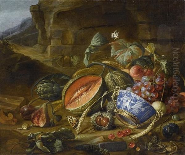 Fruchtestilleben Mit Pfirsichen, Trauben Und Kirschen In Einer Schale, Mit Insekten Und Schmetterlingen Vor Einer Grotte