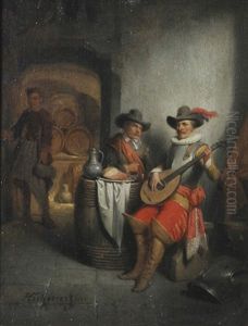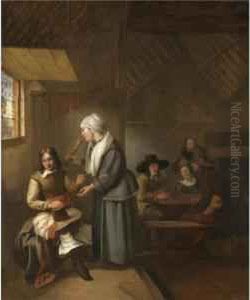 Soldiers Before A Tavern Drawing Water From A Well And Watering Their Horses