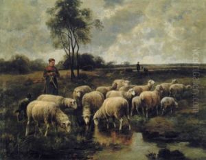 Huhner Und Ruhende Schafe In Weiter Hollandischer Landschaft Vor Einer Stadt