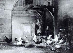 Poultry Near A Barn With Harvesters Working In A Field Beyond
