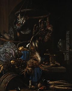 A Dead Partridge Hanging From A Nail, With Adead Pheasant, Two Hares And Hunting Paraphernalia On A Marbleledge In A Painted Stone Niche