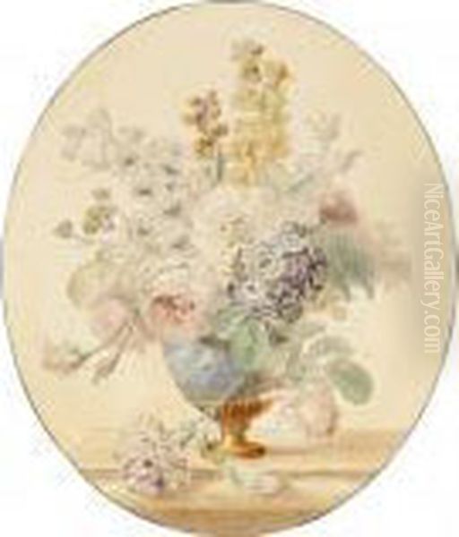 A Pair Of Flower Still Lifes In Vases On A Ledge