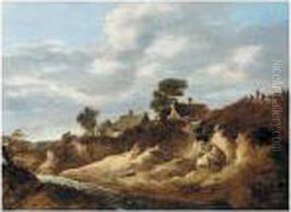 A Dune Landscape With Figures On The Brow Of A Hill Near Some Cottages