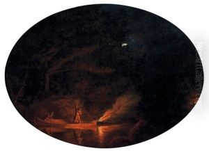 Indian Encampment With Canoe, Two Figures And A Dog
