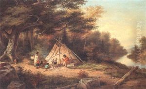 Indian Family Around A Campfire With Birchbark Tepee And Canoe