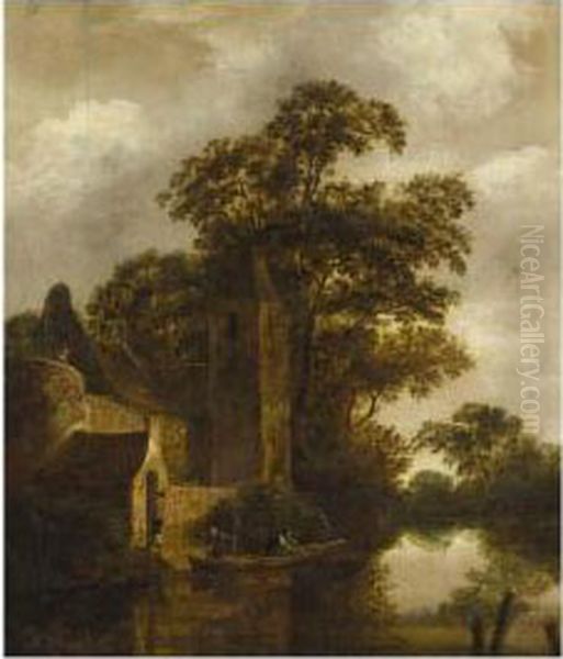 River Landscape With Fishermen In A Boat Before A House