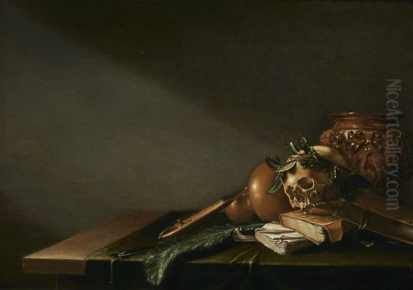 Bring the timeless beauty of D. Witting's Vanitas still life with a skull, books, string instrument and peacock feather on a table into your home with a handmade oil painting reproduction. Carefully recreated on canvas by skilled artists using traditional techniques, this piece captures the delicate brushwork, subtle light, and vibrant color of the original masterpiece. With museum-level quality and rich texture, it brings elegance and artistic depth to any space. Enjoy free shipping and make this masterpiece a part of your personal collection.