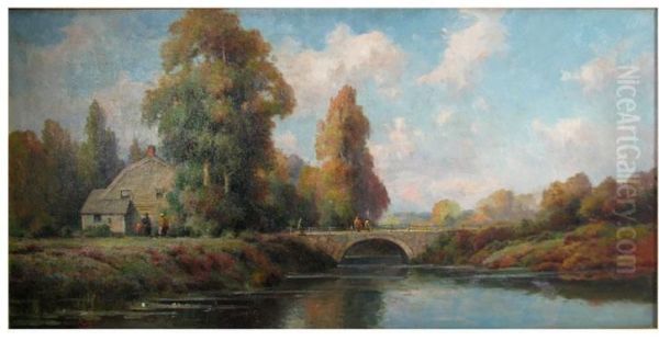 House By River With People And Stone Bridge