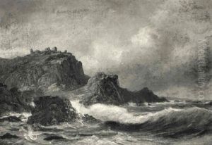 Oprort Hav Ved Klippekyst, I Forgrunden To Maend Pa Strandbredden, I Baggrunden Forlist Sejlskib