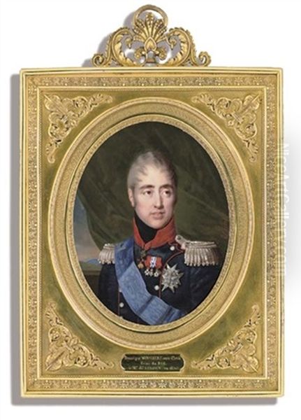King Charles X Of France, In Red-piped Blue Uniform With Red Collar, Black Stock And Silver Epaulettes, Green Curtain And Mountain Landscape Beyond