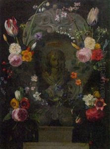 A Garland Of Holly, Tulips, Roses And Other Flowers Beneath A Sculptural Bust In A Niche