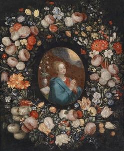 Barockkartusche Mit Drei Blumengirlanden. Im Mittelfeld Das Bildnis Eines Jungen Madchens.