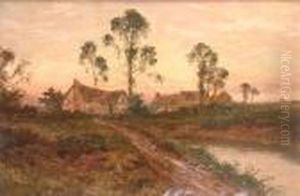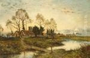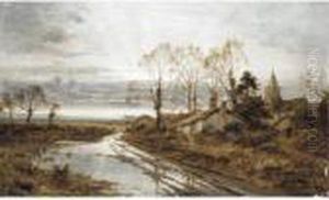 River Landscape, With Rowing Boat, Thatched Cottage And Church