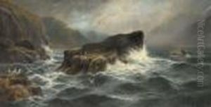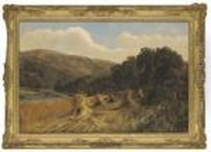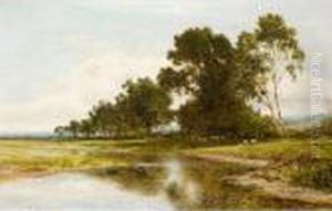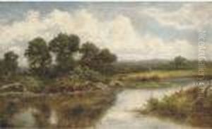 A Drover And Sheep Beside A Barn, With Ducks By A River In The Foreground