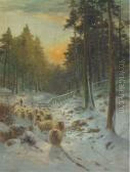 A Shepherd And His Flock In A Winter Landscape, Dawn