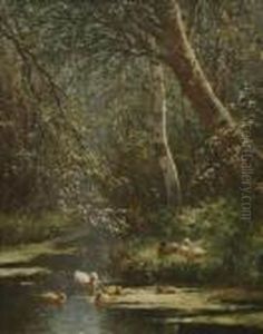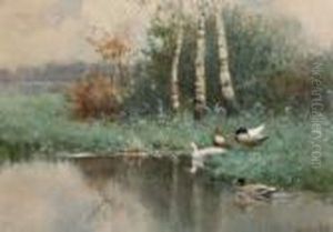 Ducks In A Birch Tree-lined Brook