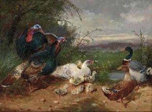 Ducks Near Two Willows On The Bank Of A Stream
