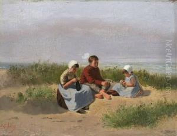 Panel "children Knitting On The Beach" Signed D'ap Artz Lower Left. Two (2) Small Spots Inpainted A Minor Scrape Or Two