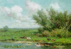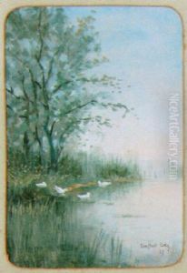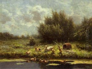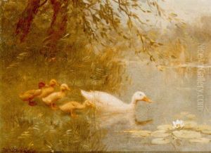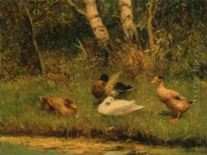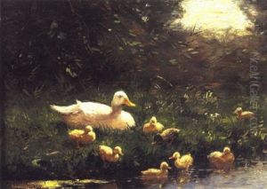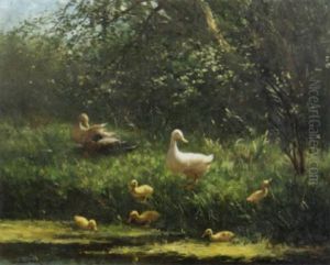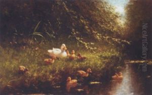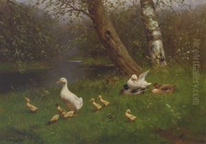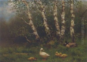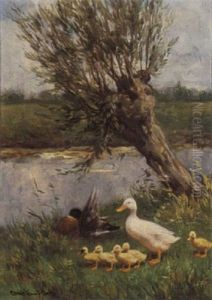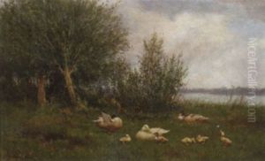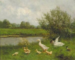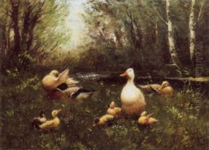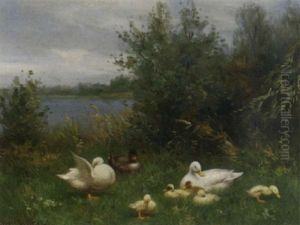 Landscape Of Ducks And Ducklings Alongside A Riverbank