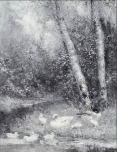 Ganse Und Enten In Hohem Gras Zwischen Birken