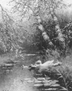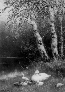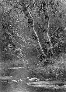 Entenfamilie Am Wasser Vor Alten Birken