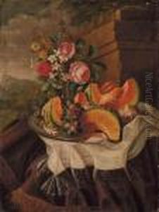 A Still Life Of Oysters, Grapes, Cherries, Roses, Corn, Snails, A Melon And A Silver Sugar Shaker On A Stone Plinth