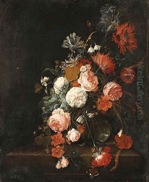 Roses, Poppies, Ears of Corn and other Flowers in a glass Vase, with Snails, a Moth, a Spider and a Butterfly on a stone Ledge
