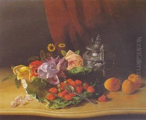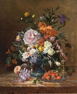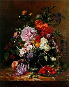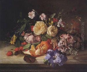 Still Life Of Flowers With Strawberries On A Marble Ledge