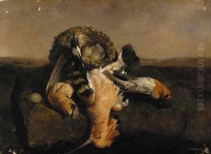 Hollandsk Interior Med Hund, Der Vogter Over Opstilling Med Jagtbytte, Rod Hummer, Grontsager Og Blomster