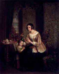 Interior Med Mor, Der Laerer Sin Lille Datter At Bede Aftenbon