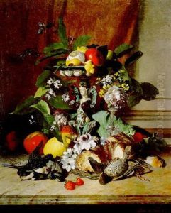 Fleurs, Fruits Et Oiseaux Sur Un Entablement (+ Fleurs, Legumes Et Lievre Sur Un Sol Dalle; 2 Works)