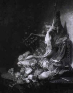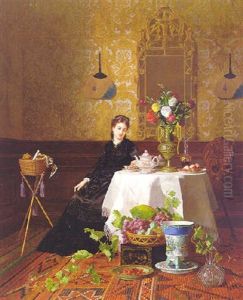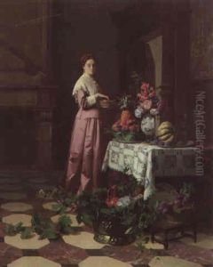 A Young Lady Seated At A Table In An Interior With Flowers, Fruits And Other Objects D'arts