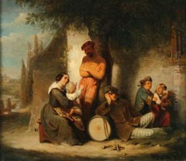 Italiaans Landschap Met Enkele Rustende Artiesten Onder Een Boom