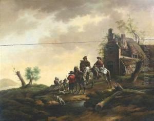 Elegant Riders Resting Beside A Fountain At The Steps Of A Large House; And Riders Taking Refreshment Beside A Country Inn