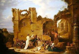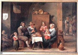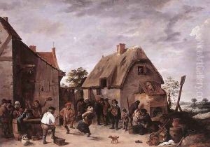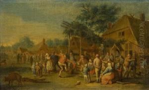 A peasant couple dancing to the music of a bagpiper, standing on a barrel, with other peasants merrymaking, ouside an inn