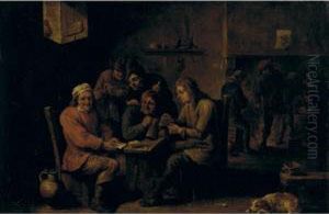 Peasants reading a letter, drinking and smoking in an inn, figures by a fireplace beyond