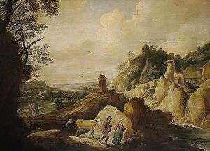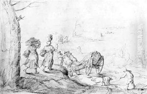 Two women going to market, other figures with carts and pigs on a road in an extensive landscape