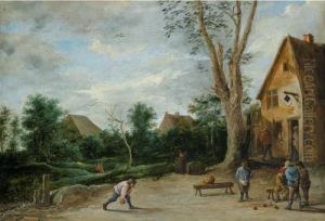 Village Scene With Four Peasants Playing Bowls Before A Tavern Two Cottages Beyond