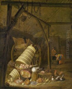 An Interior Scene With Pots, Barrels, Baskets, Onions And Cabbageswith Boors Carousing In The Background