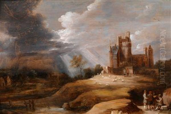 Landschaft Mit Einer Burg Und Sich Unterhaltendenmannern Bei Aufkommendem Sturm