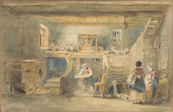 The Interior of Pitlessie Mill with a Man Sieving Corn