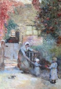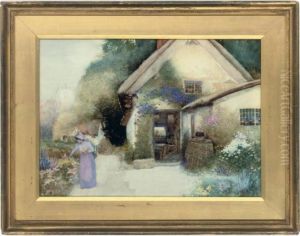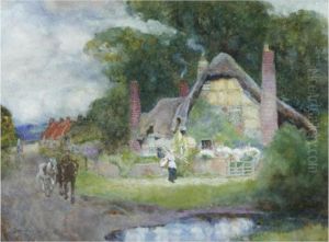 Two Ladies Gossiping Over A Fence Outside A Cottage With Well