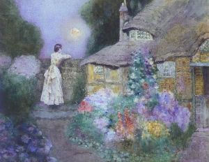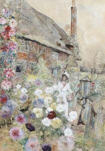 Girl In A White Dress Outside A Thatched Cottage With Hollyhocks