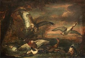 A Hare, Ducks, Other Fowl And A Brace Of Hounds, In A Forest Landscape