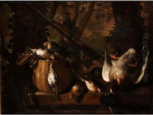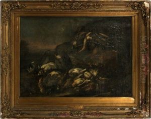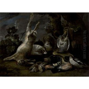 A Spaniel, With Dead Birds In A Basket And A Dead Rabbit, In A Landscape