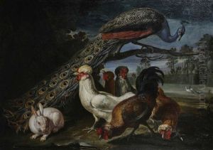 A Peacock, Turkey, Rabbits, And Cockerel In A Landscape