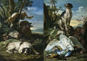 A Still Life Of A Suspended Dead Hare And Two Mallards, Dead Birds And A Dog With Hunting Gear, An Extensive Landscape In The Background (2 Works)
