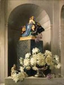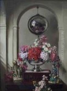 Still Life Study Offlowers In A Silver Campana Vase Beside A Figurine And Bowl