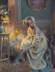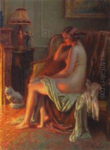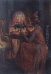 A Semi-nude Lady Seated Beside A Lamp In A Boudoir